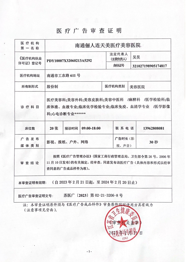 南通儷人連天美醫(yī)療美容醫(yī)院是與著名的醫(yī)療美容集團合作建立的醫(yī)院,醫(yī)院提供高品質(zhì)的醫(yī)療美容服務。2008年,南通儷人連天美醫(yī)療美容醫(yī)院落戶南通,成為由南通衛(wèi)生局審批的專業(yè)醫(yī)療美容醫(yī)院。南通儷人連天美醫(yī)療美容醫(yī)院,特別設有專業(yè)的整形美容科、皮膚美容科和微創(chuàng)美容科三大科室,致力于為廣大求美者提供全方位的醫(yī)療美容服務。南通儷人連天美醫(yī)療美容醫(yī)院為求美者建立個人終生美麗檔案,一對一進行細致服務。 11年來,南通儷人連天美醫(yī)療美容醫(yī)院,不斷引進先進設備,不斷完善醫(yī)美技術,一批優(yōu)秀、專業(yè)而穩(wěn)定的醫(yī)生團隊,為無數(shù)求美者鑄就美麗夢想。